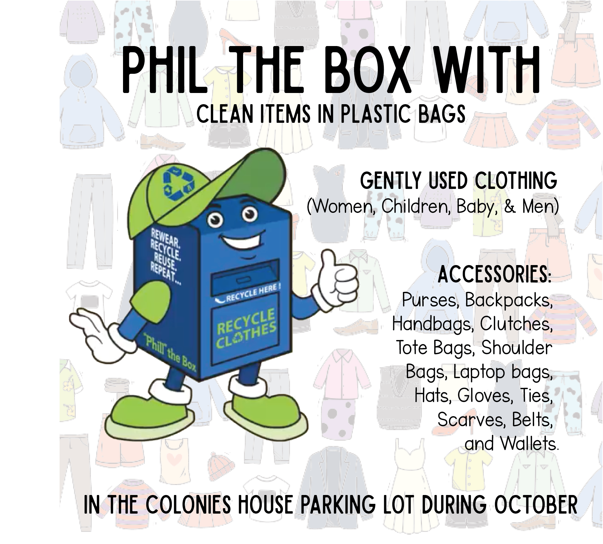 Place your gently used items in the blue box near our sign.