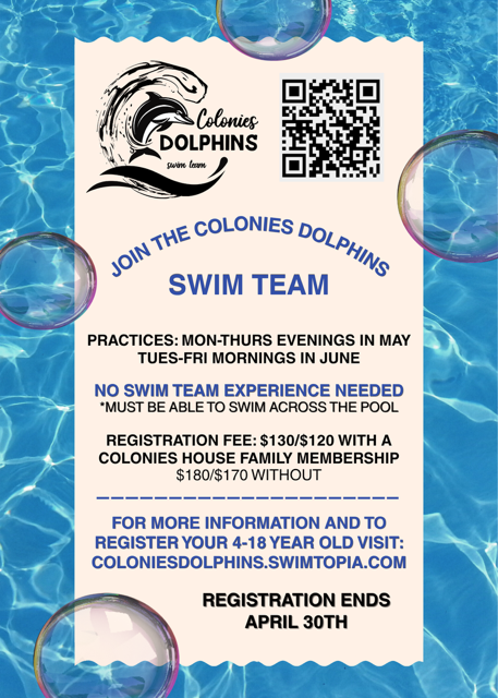 Swim Team Discounts: Family memberships receive a $50 discount on each registration for our Dolphin Swim Team, ages 6-18. Swim Team Families will have the opportunity to join Colonies House at a discounted rate during the month of April.